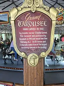 Knoebels has two carousels: one small merry-go-round in Kiddieland (added in 1976) which was built by Stein & Goldstein in 1910; and the Grand Carousel, a 1913 carousel built by Kremer's Carousel Works in Long Island City, with a frame by Charles I. D. Looff, (1852–1918), and 63 hand-carved horses by Charles Carmel (1869–1931). It was purchased on January 26, 1942, from Riverside Park in Piscataway Township, New Jersey, for $4,000 (equal to $71,642 today) and relocated to Knoebels. Today, the Knoebels Grand Carousel is one of the largest carousels in the world, with 63 horses and 3 chariots. It is one of the few carousels remaining with a working ring dispenser, allowing riders on the outside row of horses to reach out and grab steel rings as they pass. The rider who grabs the brass ring receives the cost of the ride in tickets, making the ride free.[12] Three band or fairground organs provide music for the riders. The largest, "the Frati," was built in Germany in 1888 by Frati & Co. Berlin, and was converted to Artizan rolls in the 1920s. The smaller, outside organ is "the Berni," a 1910 Gebruder Bruder, style 107, sold in the US by the August Berni Organ Company in New York. The Frati and Berni have operated at Knoebels since its purchase in 1942. The smallest one is a Wilhem Bruder organ, model 79, converted to a Wurlitzer 125 duplex roll system, and restored in 1996.[13] The Grand Carousel has always been voted the best carousel in the Golden Ticket Awards competition held by Amusement Today since 2007. The carousel competition was retired in 2019, because the Grand Carousel had been undefeated.[14] Today, the Grand Carousel is the second-oldest ride in the park. The S&G Carousel is the oldest at 113 years old in the 2023 season.