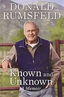 Known and Unknown: A Memoir is an autobiographical book by Donald Rumsfeld published through Penguin Group USA in February 2011. It covers a variety of his experiences such as serving as a member of the United States House of Representatives in the late 60s, as a member of the Nixon and Ford administrations during the Watergate scandal and Vietnam War, and as George W. Bush's Secretary of Defense at the onset of the War on Terror.[1]
