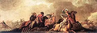Suvorov's troops grew angry due to resistance and also due to tales of atrocities committed against Russian troops in the spring, leading to Suvorov's army to commit to an assault.[44] On 4 November, the joint Russian forces started the Battle of Praga, after the name of the right-bank suburb of Warsaw where it took place. After four hours of brutal hand-to-hand fighting, the 22,000-strong Russian forces broke through the Polish defences and Suvorov allowed his Cossacks to loot and burn Warsaw.[40]: 210 Approximately 20,000 were murdered in the Praga massacre.[40]: 211 Zajaczek fled wounded, abandoning the Polish army.[40]: 195