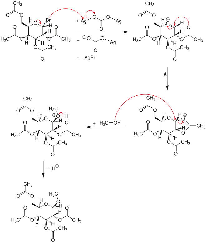 In the first step of the mechanism, the glycosyl bromide reacts with silver carbonate upon elimination of silver bromide and the silver carbonate anion to the oxocarbenium ion. From this structure a dioxolanium ring is formed, which is attacked by methanol via an SN
