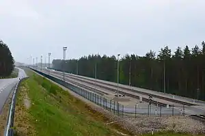 Koidula railway station (Estonian: Koidula raudteejaam) is a railway station in Koidula, Estonia, on the Russian border. It merges the Tartu–Pechory and Valga–Pechory railways just before the Russian border (Pechory is located straight after the border). The station opened in September 2011, and is a few metres from the border with Russia.[2][3] The main purpose of the station is making the crossing of Russian border easier for both goods and passengers. It also enabled the traffic on "Southeast Estonian Triangle" (Tartu–Valga–Piusa–Tartu) without crossing the Russian border. Currently however there are no cross-border passenger trains, and services from Pskov to Pechory do not connect with the Elron services in Estonia.[4]