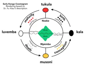 According to Molefi Kete Asante, "Another important characteristic of Bakongo cosmology is the sun and its movements. The rising, peaking, setting, and absence of the sun provide the essential pattern for Bakongo religious culture. These 'four moments of the sun' equate with the four stages of life: conception, birth, maturity, and death. For the Bakongo, everything transitions through these stages: planets, plants, animals, people, societies, and even ideas. This vital cycle is depicted by a circle with a cross inside. In this cosmogram or dikenga, the meeting point of the two lines of the cross is the most powerful point and where the person stands."[7]