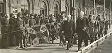 Päts was one of the candidates in the presidential elections that were supposed to be held in April 1934, but the Vaps Movement candidate Andres Larka and even lieutenant general Johan Laidoner were both clearly more popular candidates than Päts in the public opinion. The campaign was accompanied by threats by the Vaps Movement to take power and rumours of a forthcoming coup. In early March 1934, Päts's political opponent Jaan Tõnisson compared the Vaps Movement with the Nazis in Germany and advised the government to take necessary action against the movement.[33] Konstantin Päts then carried out a self-coup on 12 March 1934.[35] He was supported by general Johan Laidoner and the army.[3]