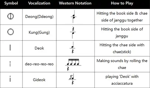 Jangdan, used in Jeong-Ak, is usually played by Janggu. It is often used in Jangdan in Young-San-Hoe-Sang(靈山會相). Also, Jangdan's music for national ceremonies is an example. There are many combinations of rhythms in slow Jeong-Ak Jangdan, many Doduri in normal speed Jangdan, and many Ta-ryoung in fast Jangdan.