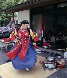 The ritual begins with the mudang inviting supernatural entities to the altar, after which they set out to entertain them.[295] Music will often be involved in the kut.[268] Musical instruments typically involved in kut include cymbals, hourglass-shaped drums called changgu, and a gong.[296] Also sometimes featured is a pipe, the p'iri.[297] The kut will often begin with drumming.[261] The mudang will often dance to the beat of the drums, often swirling in circles, something believed to facilitate the possession trance.[298] They may hold short sticks to which white paper streamers are attached; this device is intended to help channel the spirits into the mudang's body.[280]