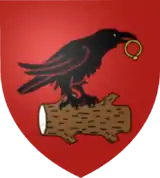 Gules, on a cut off tree stump laid sideways proper, between two upper and two lower knots stands a left facing raven sable, in its beak, a ring or with the diamond facing down. In the crest, above a crowned helmet, there are three ostrich feathers.
