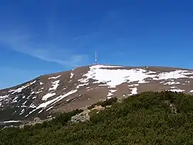 Kráľova hoľa (Slovak pronunciation: [ˈkraːʎɔʋa ˈɦɔʎa]; German: Königsberg; Hungarian: Király-hegy,[1] literally "King's Mountain") is the highest mountain (1,946 m) of the eastern part of the Low Tatras in central Slovakia. Four rivers rise at its foot: Čierny Váh, Hnilec, Hornád, and Hron. The summit, easily accessible by hiking trails from Telgárt as well as by a paved road from Šumiac (not open to motor vehicles, except for the mountain rescue service and maintenance workers of the TV transmitter on the summit), offers a panoramic view of Spiš, the Tatras, Liptov, and the Upper Hron Valley. Largely deforested by exploitative timber harvesting in the early 19th century, its timberline was restored to its natural elevation of about 1,650 m (5,413 ft.) through the efforts of Ludwig Greiner in the second half of that century.[2]