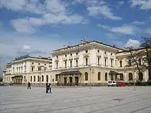 The railway station was situated in a historical building, constructed between 1844 and 1847 by Rosenbaum, which lies parallel to the tracks. The design was chosen to allow for future line expansion. The station was initially a terminus of the Kraków – Upper Silesia Railway (Kolej Krakowsko-Górnośląska, German: Oberschlesische-Krakauer Eisenbahn). Trains entered the trainshed via a brick archway at the northern end of the station which was almost doubled in size in 1871.[1] In 2014, a new building was opened.