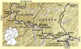 The need for a rail connection between the (upper) Lahn valley and the Ruhr was first identified by Splingard, chief engineer of the then Electorate of Hesse, in 1847. His intention was to build a main line from Cologne to Marburg, in order to enable a direct east–west connection on the Breslau–Dresden–Leipzig–Halle–Kassel–Marburg–Cologne–Ostend route, connecting by steamship to London.[2] The cost of the entire line from Marburg to Cologne via Biedenkopf and Siegen, including branch lines to coal mines, was estimated at around 28 million guilders, but only slightly less than 900,000 guilders had to be raised for the section between Kreuztal and Cölbe, since there was little requirement for expensive tunnels, embankments and other structures. The planning phase was interrupted by the effects of the German revolution of 1848. Later memoranda and publications repeatedly mentioned an Oberlahn-Eisenbahn (Upper Lahn Railway), Lenne-Lahn-Bahn durch das Oberlahnthal (Lenne-Lahn Railway through the Upper Lahn Valley) or Ruhr-Lenne-(Sieg-)Oberlahn-Eisenbahn (Ruhr-Lenne-(Sieg-) Upper Lahn Railway) between Siegen and Marburg in Rede, which gave the Oberen Lahntalbahn (Upper Lahn Valley Railway) its name.[3][4] It was not until 1863 that the treaty was contracted between Hesse, Prussia and Electorate Hesse to allow the building of a connection.[5]