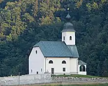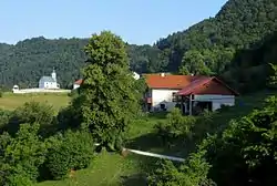 The local church, dedicated to the Holy Cross, was first mentioned in written sources in 1526. The very first church in the village stood at a somewhat lower location, next to the Vodnik house.[7] The current church was restored after being damaged in a fire in 1944. There is a small cemetery behind the church. The cemetery was established by the priest Anton Komlanec (1884–1966) after he was assigned to the parish. Previously the villagers had used the cemetery in Moravče, an hour and a half away.[8]