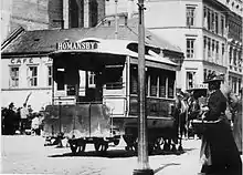 KSS had a concession which expired in 1905, at which time the municipality could purchase the company at par value. This raised a new debate concerning public or private operations, with many Conservative politicians calling for the privatization of KKS.[27] In the 1904 municipal election the issue was raised, with the Liberal Party and the socialist parties running for municipalization of tram operations. Meanwhile, the municipal administration worked with estimates for taking over KSS. A take-over would cost the municipality about NOK 2 million, while a sale would bring in about NOK 1.6 million. However, as KSS was a profitable company, it was estimated that the municipality would make more money by taking over KSS than selling KKS, estimated at about NOK 3 million for the period in question. The decisive municipal council meeting was held on 14 April 1905, although the actual vote did not occur until 02:00 hours the following day, after a nine-hour debate.[28] The Conservative majority voted in favor of selling KKS to KSS and extending the latter's concession to 1924.[29]