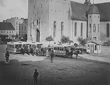 Homansbyen Depot was constructed with a building housing the company's administrative office, horse stables, a wagon depot, a forge, and a weighing shed. These installations were designed by the Norwegian architect Henrik Thrap-Meyer.[44] It was expanded in conjunction with the electrification.[45] KSS had a depot at Grünerløkka from 1880 to 1899. When it then extended the line to Torshov, it built a new depot there and closed the one at Grünerløkka.[46] KSS took over Sagene Depot and Rodeløkka Depot with the KKS takeover, but the latter was immediately closed.[47] The company's final depot opening took place in 1922, when it opened Vålerenga Depot.[30]