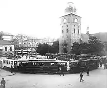 By 1897 the Liberal Party had received a majority in the municipal council. The party had as part of its program stated that it wanted to municipalize the tramway operations.[22] That year there was a political debate regarding an expansion of the KSS' tramway towards St. Hanshaugen and Sagene, two areas which were being developed. KSS applied to build a tramway there, but on 23 September 1897 the municipal council voted to establish its own tram company, Kristiania Kommunale Sporveie (KKS), and build a line to St. Hanshaugen Sagene itself.[23] This resulted in three new lines. Sagene Ring opened in November 1899.[24][25] The Rodeløkka Line, which opened in January 1900, used the lower section of the Grünerløkka Line to reach the city center. The Vippetangen Line was completed in August. However, none of the three lines connected with each other and KKS had to lease track from KSS.[26]