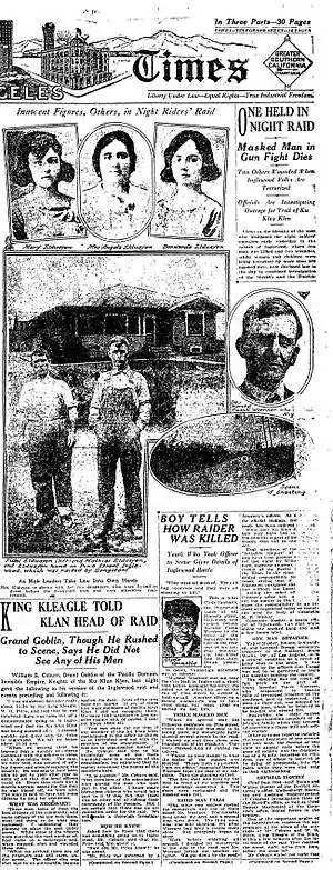 - ↑ "State Bolsters Case Against 'Night Riders'; Witness Tells of Klan Gathering on Night Preceding Raid to Lay Plans for Attack," Los Angeles Times, August 15, 1922, section 2, pages 1 and 5