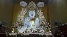 The Kyauktawgyi Buddha is a huge sculpted image of the Buddha seated in the Bhūmipassa Mudrā (ဘူဖဿမုဒြာ).[1] The figure was sculpted from a single block of pale green marble quarried at Sagyin, 12 miles (19 km) north of Mandalay.[1] The stone block was transported over the course of 13 days, requiring the manpower of 10,000 to 12,000 men, to the temple site, where it was carved. The image was consecrated in 1865.[1]
