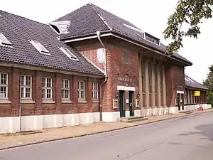 The station was built by the Lübeck-Büchen Railway Company (Lübeck-Büchener Eisenbahn, LBE), which opened the railway from Lübeck to Travemünde in 1882. It originally ended at Travemünde Hafen station, but the line was extended to Travemünde Strand station in 1898. A three km-long branch line from Travemünde Hafen station to Niendorf on the Baltic Sea was opened in 1913 to improve access to this tourist spot. As part of this work a new station building was built to a design by Fritz Klingholz, who had also designed the new Travemünde Strand station a little earlier. The branch line to Niendorf, however, was closed in 1974. The station building was sold in 1996 and is now used as a restaurant. The station, which has been heritage-listed since 1992,[3] was modernised in 2004 and a new outdoor platform was built on the former track 1 next to the former station building.[4] The island platform on tracks 2 and 3 was abandoned. The freight tracks with a free loading track and loading ramp west of the entrance building (tracks 12 and 13) and the tracks north of the platforms (track 4–8) were abandoned and are no longer connected and have been partly dismantled. The station and the track have been electrified since 2008.