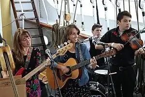 L'Angélus is an American band composed of four siblings, Katie, Paige, Johnny, and Stephen Rees, who play in a variety of genres, but in recent years have emphasized their Louisiana roots, performing a mixture of cajun fiddle tunes, swing, saxophone driven swamp pop, and New Orleans-influenced R&B. Their music has received acclaim for its muscular energy, dynamic syncopated fiddle, and rich vocal harmonies.[1][2] The band's members, now in their 20s, share the role of lead vocals. Katie, the oldest, plays guitar, Paige bass, Johnny drums, and Stephen, the youngest, plays fiddle, accordion, saxophone, and harmonica. As of 2016, the band was on indefinite hiatus.[3]