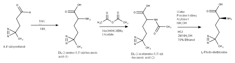 Racemic Photo-Methionine is synthesized from 4,4'-azi-pentanal by the Strecker amino acid synthesis.[1] The L enantiomer is separated by enzymatic resolution of the acetamide.