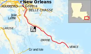 Louisiana Highway 23 (LA 23) is a north–south state highway in Louisiana that serves Plaquemines and Jefferson Parishes. It spans 74.0 miles (119.1 km) in roughly a southeast to northwest direction.[1] It is known locally as Belle Chasse Highway, Lafayette Street, the West Bank Expressway, and Franklin Avenue.