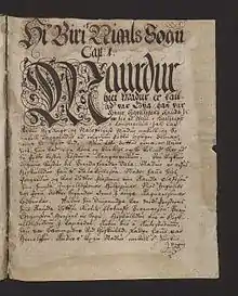The oldest literary references to homosexuality in Iceland are found in the Sagas of Icelanders, texts written during the Middle Ages that include terms such as "ragur", "stroðinn", and "sorðinn", terms which are used to describe gay, effeminate, or cowardly men.[2] Some researchers, like Professor Óttar Guðmundsson, have identified homoerotic elements in works like Njál's Saga, particularly in the relationship between the protagonist and his friend Gunnar. This saga was the favorite book of the Icelandic LGBT community in the mid-20th century because of the relationship between these two characters.[1]