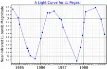 A near-infrared (L- band) light curve for LL Pegasi, plotted from data published by Le Bertre (1992)[8]