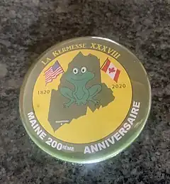 Established in 1982, La Kermesse has been a celebration of French Canadian culture in Maine with live music, games and entertainment.[6][7] In 1997, the Festival shifted to include all groups in the city.[7] Throughout its history the festival has used a green frog as its mascot and pin-back buttons to confirm entry.[8] These buttons get changed every year and so people collect and trade them.[1][8] Fireworks are also a prominent feature of the festival.[9] After being postponed by COVID-19 in 2020,[10] La Kermesse returned in 2022.[11]