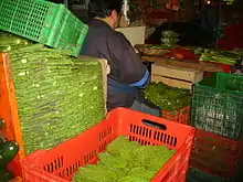 Basic Mexican foodstuffs is the backbone of this markets selling Mexican spices such as epazote,[1] chili peppers fresh and dried of just about every variety, nopals (cactus pads), chicharrones (fried pig skins), corn, and less commonly-encountered products like wild mushrooms.[5][12] One of the few places to find truly authentic Oaxaca cheese in the city. Vendors can be seen tying stacks of banana leaves, cutting spines from nopals, and selling “secret” herbal remedies.[12]