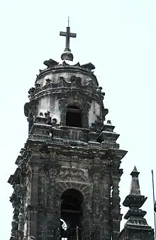 The tower rises to the side of the main facade.[2] It is topped by a very large sculpture of the papal crown, representing the supreme authority of the papacy. It contains estipite columns which were never finished and are unique among churches in Mexico City.[1][2]