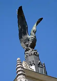 It is located on the corner of Alcalá street and Virgen de los Peligros street. It was built between 1928 and 1931, based on the project of the Spanish architect Modesto López Otero,[1] with the collaboration of Miguel de los Santos.[2] Valentín Vallhonrat company carried the works out.[3] The authorship of the sculpture that pinnacles the building refers to «sculptor Camps»,[1] whose identity is doubtful, it is unknown whether it is related to Vicente Camps Bru or Josep Maria Camps i Arnau.[4] The building site was acquired for two millions of pesetas in 1928.[1] One of the keys of the project was the integration of the new skyscraper in a harmonic way with the adjacent church of Las Calatravas, both have shaped an urban entity.[5] It is one of the more notorious works of López Otero[6] and its design involves an evolution from López Otero's "regionalist eclecticism" of his first works to a more «mature» style, after traveling to United States or Vienna.[6]