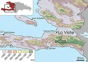 La Visite National Park (French: Parc National La Visite) is one of the two largest national parks of the Republic of Haiti. La Visite is a part of the Massif de la Selle mountain range. Its highest peak is 2275 meters in elevation. The park covers approximately 11,419 hectares of land with 1897 hectares above 2000 meters in elevation, and consists mainly of pine forest, grasslands, and some montane broadleaf forest above 1,700 m (5,600 ft) elevation.[1] The Haitian government established the La Visite National Park in 1983. The capital, Port-au-Prince, is only 22 kilometers north from the park.[2] The northern boundary of La Visite National Park is the east-west running escarpment of the Massif de la Selle.