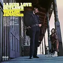 Ladies Love Outlaws and Jennings' previous album Good Hearted Woman marked a change in Jennings' appearance.[13] The cover of Ladies Love Outlaws shows Jennings on a scene set in an Old West motif, dressed in black with a revolver strapped to his waist,[14]looking at his five-year-old niece, Ladonna.[11] Previously, Jennings kept his hair short and his face clean-shaven, and he wore suits. After the release of Ladies Love Outlaws, he started to wear faded jeans and cowboy boots.[13]