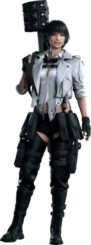 She appears in Devil May Cry: The Animated Series as a solo demon hunter who sometimes calls on Dante for help.[13] She has a cameo appearance in Devil May Cry 4, asking Dante and Trish for help in defeating the Order of the Sword, which has been creating their own weapons: Devil Arms.[14] In the epilogue, she gives only a small amount of money to the duo as reward for dismantling the organization, while blaming them for generating chaos on the mission.[15] In a special edition of the fourth game, she and Trish replaces Nero and Dante respectively in their own episode, whereas Lady's gameplay heavily focus on her firearms. She is also present in Devil May Cry 5 but unplayable.[16] In the game's story, Lady, Trish and Dante are defeated by the Demon King Urizen and she is placed inside a demon until Nero rescues her.[17][18]