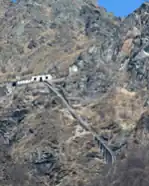 During 20s, four plants were built in order to transport the materials from the valley floor to the Barbellino wide valley. The first cableway started from Valbondione town and used to reach Antonio Curò shelter. It was 4,5 km long and had 1000 m (3280.84 ft) of difference in height, carrying a maximum of 10 ton of material. A second cableway was built from the valley floor Grumetti up to Mount Pinnacolo with 1,2 km length and 800 m (2624.67 ft) of difference in height. The heaviest materials were carried with this cableway since it could transport up to 3000 kg materials. Once reached the Pinnacolo, the materials were loaded up to a small train passing through a tunnel which led to Valmorta dam. The third cableway was built in parallel to the first one making the same way but carrying only cement materials. To conclude, another slope cableway was built to bring workers from the valley floor upwards. It worked till 70s, when a new funicular railway was built.[11]