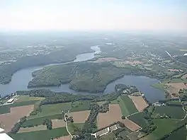 Lake Guerlédan (French pronunciation: [ɡɛʁledɑ̃]; Breton: Lenn Gwerledan) is an artificial lake in the centre of Brittany, France. It extends across the borders of the departments of Morbihan and Côtes-d'Armor, within the communes of Saint-Aignan, Morbihan and Mûr-de-Bretagne. At an elevation of 121 m, its surface area is 4 km². Lake Guerlédan is the largest artificial lake in Brittany.