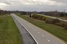 Long-term plans for the parkway called for it to extend westward along the entirety of the Lake Ontario shoreline to Niagara Falls, and from there as far southward as Buffalo.[23] By 1960, the proposed routing was adjusted to meet the northern end of the Robert Moses State Parkway in Porter, near Fort Niagara.[24] When the city of Niagara Falls released its Regional Highway Plan for the Buffalo–Niagara Falls area in 1971, the proposed routing of the Lake Ontario State Parkway was unchanged.[25] Despite the widespread intentions of extending the parkway westward to Niagara County, the highway never extended any farther westward than Lakeside Beach State Park.[26] The lone portion of the extension that was built—between Hamlin Beach and Lakeside Beach state parks—was constructed between 1969 and December 1972 and officially opened on February 16, 1973.[20]
