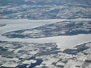 Lake Scugog is an artificially flooded lake in Scugog, Regional Municipality of Durham and the unitary city of Kawartha Lakes in central Ontario, Canada.[1] It lies between the communities of Port Perry and Lindsay. The lake has been raised and lowered several times over its history. Though not technically part of the Kawartha lakes due to its shallow depths, it is often geographically linked to them. Its sole outflow, the Scugog River, connects to Sturgeon Lake. Lake Scugog is in the Great Lakes Basin and forms part of the Trent–Severn Waterway.
