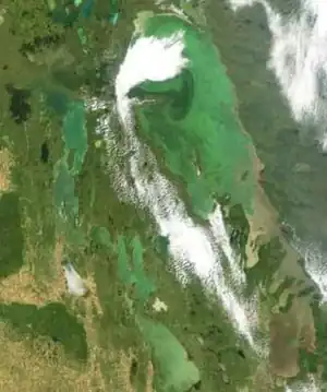 Environment Canada reports that the amount of nitrogen and phosphorus in Lake Winnipeg has increased dramatically since the 1990s. The causes are a massive increase in the use of agricultural fertilizer, burning of fossil fuels, development of large urban populations, and an upsurge in land clearing and deforestation.[11] Nitrogen and phosphorus loading from human activity has accelerated eutrophication of certain rivers, lakes, and wetlands, resulting in loss of habitat, changes in biodiversity and, in some cases, loss of recreational potential.[11] Lake Winnipeg suffers from the rapid absorption of the elements phosphorus, nitrogen, and carbon. Eutrophication processes fuel the growth of blue-green algae, also known by its more correct scientific name cyanobacteria. These bacteria normally appear green in color and can turn blue when the algae (bacteria) blooms are dying. As an algae bloom dies, the microscopic cells break down, releasing toxins in the surrounding water. Once released, some toxins can linger for more than three months until sunlight and the natural population of healthy green algae in the lake degrade them.[12] Cyanobacteria typically thrive off of phosphorus when Lake Winnipeg's summer temperatures are hot and wind speeds are relatively low. Blue-green algae blooms frequently persist for several months in Lake Winnipeg until colder temperatures, currents, and changes in the seasonal weather can filter them out. The cyanobacteria's decomposition process consumes oxygen at such a high rate that this can actually suffocate Lake Winnipeg's native walleye fish species and other aquatic life. Although small amounts of blue-green algae occur naturally in Lake Winnipeg, there is no conclusive evidence of what normal levels may be. Satellite images show that blooms are occurring more frequently and are covering more surface area of the lake.[7] The Lake Winnipeg algae crisis has grown to such a large scale that the blooms can be seen from outer space.