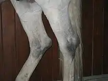 - Bog spavin: excessive synovial fluid in the tarsocrural joint, which leads to a large, soft, cool distention on the dorsal surface of the hock.[60]