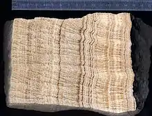 In geology, lamination (from Latin lāmina 'thin layer') is a small-scale sequence of fine layers (pl.: laminae; SG: lamina) that occurs in sedimentary rocks. Laminae are normally smaller and less pronounced than bedding. Lamination is often regarded as planar structures one centimetre or less in thickness, whereas bedding layers are greater than one centimetre.[1] However, structures from several millimetres to many centimetres have been described as laminae.[2] A single sedimentary rock can have both laminae and beds.