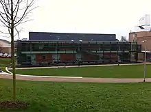In the south-west corner sits the library designed in 1964 by Tom Mellor and Partners, the first phase opening in September 1966, the second in July 1968 and the third in January 1971.[22] The library was extended in 1997 and underwent a phased refurbishment in 2014, which was completed in 2016. In 2021 the Library Extension Project[23] was completed, which introduced additional student study space and 'living walls', exhibition and research space, a 'safepod'[24] and digital studio.