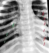 Fractured ribs in various stages of healing, typically seen from squeezing injury. Red shows old healed fractures. Green is newer fracture.
