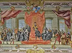 On the ceiling is a fresco by Fromiller. The ceiling mirror is framed by an "excellently constructed mock architecture in terms of perspective". The all-around portico with niches in the corners represents. In the niches are Grisailla statues of the Habsburg rulers Matthias, Ferdinand II, III, and IV. The cardinal virtues are depicted in balustrades in the center of each side. No sky opens above the mock architecture, but the hereditary homage of Emperor Charles VI is depicted. This had taken place on 22 August 1728 in the then Palais Rosenberg, now the town hall of Klagenfurt. However, Fromiller architecturally relocated it to the Great Hall of Heraldry. The emperor sits under a red canopy and is surrounded by the deputies, the ecclesiastical dignitaries, the duke's farmer, and the holders of the eleven provincial offices. The coats of arms of the latter as well as the coats of arms of Austria, Carinthia, and the ecclesiastical territories of Salzburg and Bamberg at the edge of the picture connect the homage scene with the mock architecture.