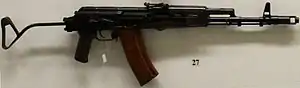 | AKM | Assault rifle | Manufactured by the state arsenal as the MPi-KM (fixed stock, later variants were distinctive stippled plastic) and MPi-KMS-72 (AKMS) with a single strut "coathanger" side-folding stock | ![]() ![]() | |