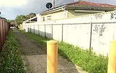 The suburban areas generally feature fenced or walled lanes that are "cut-through" residential lots, whereby granting pedestrians easy access to nearby facilities including shops, public transport, parks and other areas of interest situated on other roads.[11][12] These passageways are more often present at the end of cul-de-sacs, where they would lead to a main road. They may feature a nature strip, though others may be completely paved.[13] They are usually secured by bollards to prevent vehicle access, although cycling is permitted.[14] They bear a resemblance to ginnels found in Northern England as they are a gap between houses.[15]