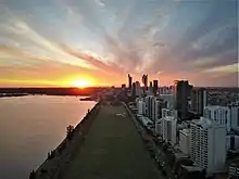 ![]() Langley Park, looking across the western end towards the Perth CBD, circa 2006. The dominant building on the right is the Federal Law Courts, the gardens in front include Government House and Supreme Court Gardens | |