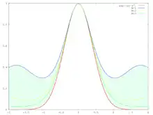 has a global maximum at 0. is shown on top for M = 0.5, and at the bottom for M = 3 (both in blue). As M grows the approximation of this function by a Gaussian function (shown in red) improves. This observation underlies Laplace's method.