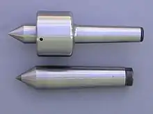 A lathe center, often shortened to center, is a tool that has been ground to a point to accurately position a workpiece on an axis. They usually have an included angle of 60°, but in heavy machining situations an angle of 75° is used.[1]