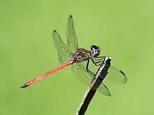 Lathrecista asiatica festa known as the Australasian slimwing[3] is a sub-species of Lathrecista asiatica, a dragonfly in the Libellulidae family, found only in Australia.[2] Its range is coastal and adjacent inland in an arc from the Northern Territory to the southern Queensland border. It is a medium-sized dragonfly with a wingspan of 60-85mm, and is usually near rivers, streams, swamps and lagoons but at times can be far from water. The male has a black and yellow thorax with brown upper parts, and a reddish-orange abdomen with a black tip.[3] The taxon has not yet been assessed for the IUCN Red List.