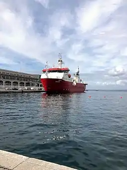 Between 1999 and 2019, RRS Ernest Shackleton was the main logistic ship for the BAS. She was used to resupply the survey's Antarctic research stations and also had a research capability. "Tula", a cargo tender stored on deck, allowed transfer ashore of stores and equipment when the ship could not berth alongside.[3] During the northern summer, she was commercially chartered, often working in the North Sea.[3] On charter to Crystal Cruise Line, she escorted its 68,000 ton liner Crystal Serenity through Canada's Northwest Passage in late August/September 2016 and 2017. In the austral summer 2019/2020, she carried out the first Antarctic mission under the Italian flag, completing two rotations between New Zealand and Zucchelli Station, the Italian Antarctic base.