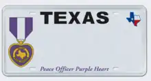 Texas also awards The Peace Office Purple Heart specialty license plate in honor of those who have earned a Peace Officer Purple Heart. Texas is the only state who has a license plate like this. This license plate has the words "Peace Officer Purple Heart" and an image of a purple heart with the State of Texas in the middle that says "Texas Peace Officer".[6]